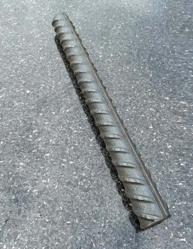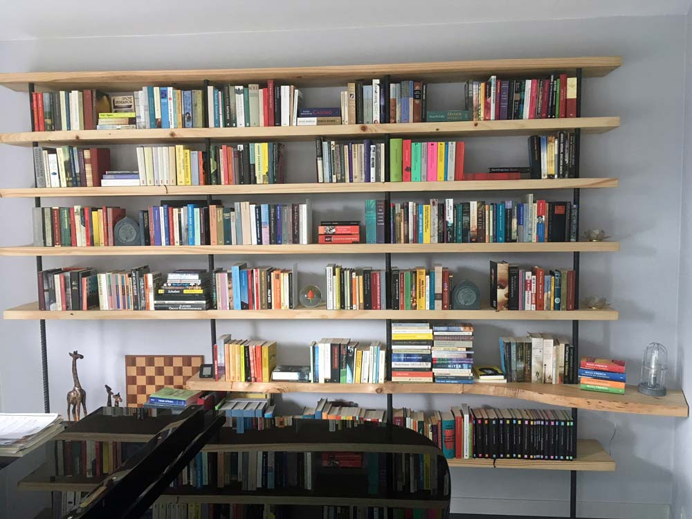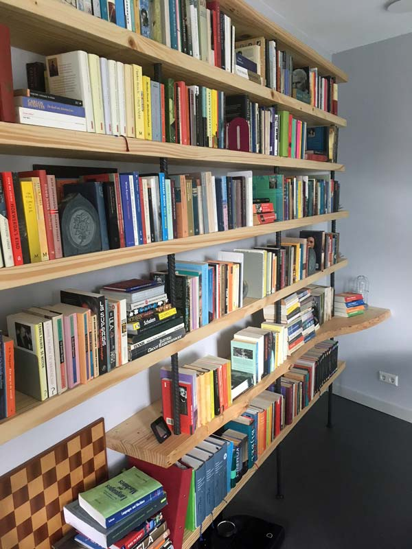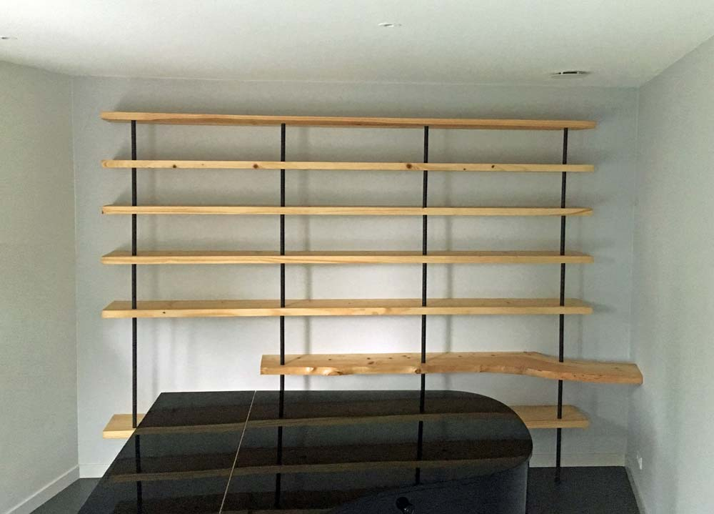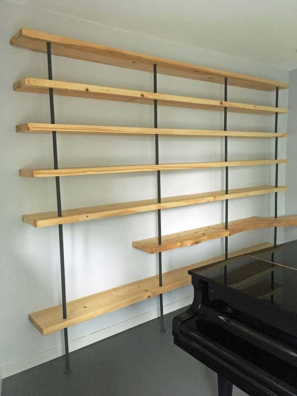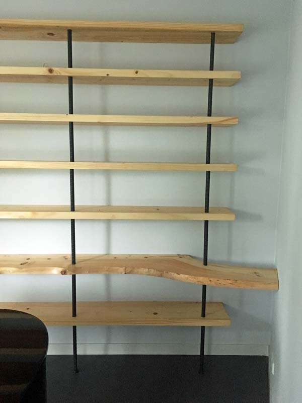 Deze boekenkast is blind aan de wand bevestigd met aan de voorzijde staanders van stoer bewapeningsstaal, van 25mm dik, die "door" de schappen heen gaan.