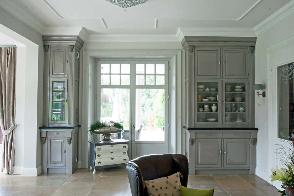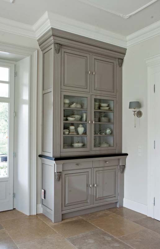De panelen in de deuren zijn voorzien van een bossing paneel en de deuren met glas bevatten facet geslepen glas.